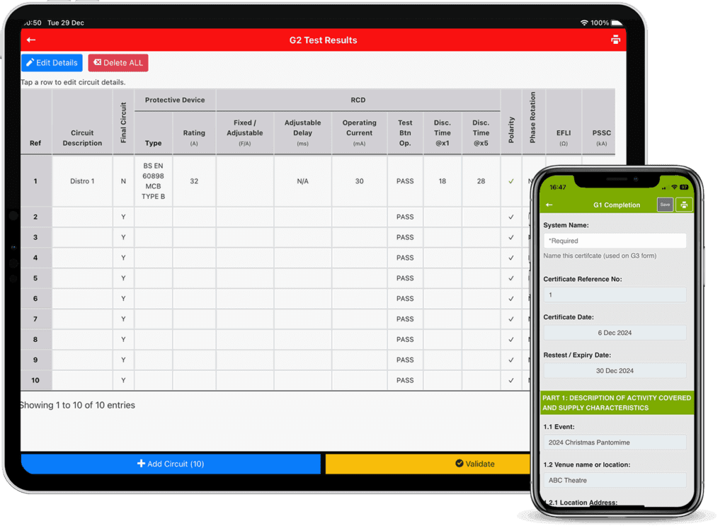 Temporary electrical system software to produce custom digital G1, G2 and G3 PDF sign-off forms based on BS 7909.