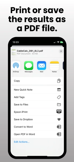 A table of results is displayed for the cable calculation results which can also be printed or saved as a PDF file.